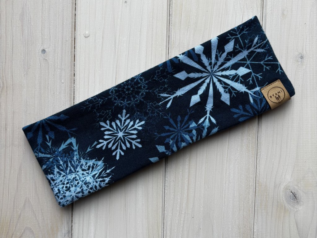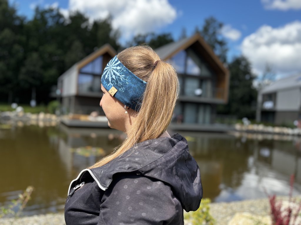 Modrá barva připomíná chladné nebe a bílé vločky dodávají jemný zimní nádech – čelenka, která doplní outfit a zároveň podrží vlasy přesně tam, kde mají být.